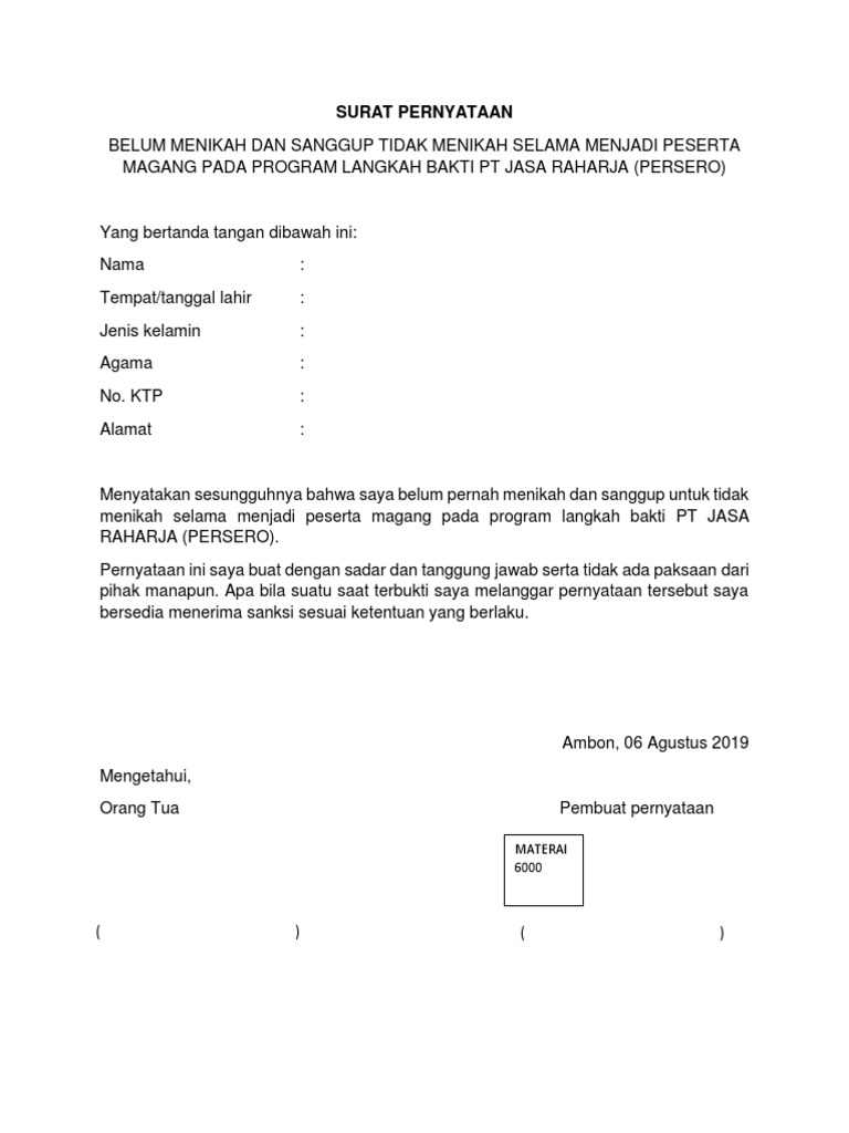 Surat pernyataan merupakan sebuah penjelasan tertulis mengenai kondisi atau situasi seseorang, dimana maksud pembuatannya adalah untuk memberikan keterangan terkait suatu hal yang penting. Dimana surat keterangan sanggup tidak menikah menjelaskan bahwa si pembuat surat berjanji untuk tidak menikah selama jangka. Sitti aisyah, a.md.keb tempat / tanggal lahir : Belum menikah dan bersedia tidak menikah selamo program magang; Contoh surat pernyataan tidak akan menikah selama 1 tahun untuk melamar kerja berbagi ilmu / selain surat keterangan magang, pihak perusahaan biasanya juga akan memberikan sertifikat magang. Selama masa ini, tidak jarang karyawan diminta membuat contoh surat pernyataan tidak menikah selama menjadi peserta magang. Contoh surat » surat keterangan » contoh surat keterangan magang kerja dari perusahaan. Contoh surat pernyataan tidak akan menikah selama 1 tahun untuk melamar kerja_ setiap instansi atau lembaga mempunyai syarat tertentu dalam merekrut karyawan baru salah satunya meminta kepada calon karyawan atau yang hendak mendaftar untuk menjadi karyawan untuk melampirkan surat pernyatan tidak akan menikah selama satu tahun jika diterima bekerja di instansi atau lembaga tersebut. Sehat jasmani, rohani & tidak buta warna (disertai surat keterangan dokter) tidak pernah terlibat narkoba atau pelanggaran hukum lainnya (disertai skck) diutamakan pelamar dari daerah asal. Dikeluarkan dari sekolah tinggi sandi negara. Surat keterangan bersedia tidak menikah selama magang / contoh surat pernyataan ijin orang tua, tidak menikah, dan bersedia ditempatkan di seluruh. Surat keterangan bersedia tidak menikah selama magang / program magang langkah bakti jasa raharja lbjr januari 2021 : Surat pernyataan tidak menikah 1.